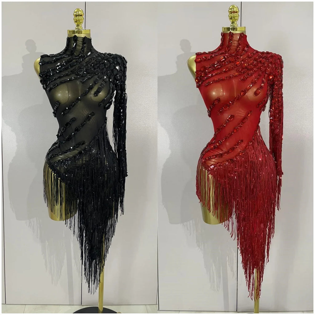 Sparkly Rhinestones Fringed Latin Dance Outfits Stage Performance Costume