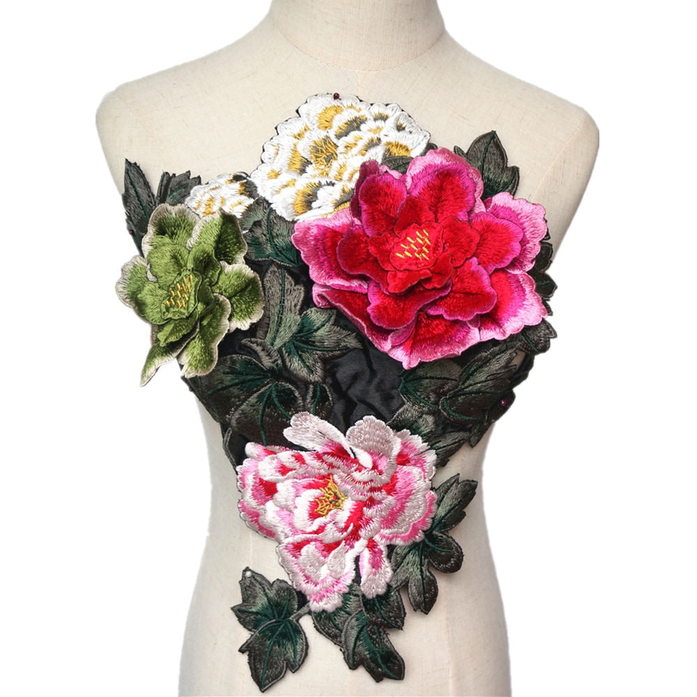 Embroidered Peony Flowers Leaves Sew On Applique Patches DIY Decoration Craft