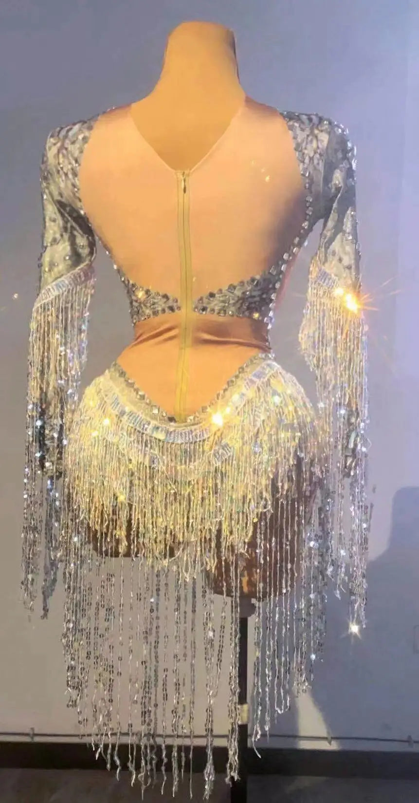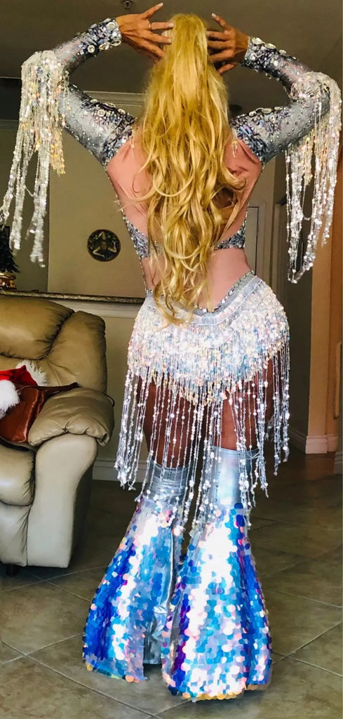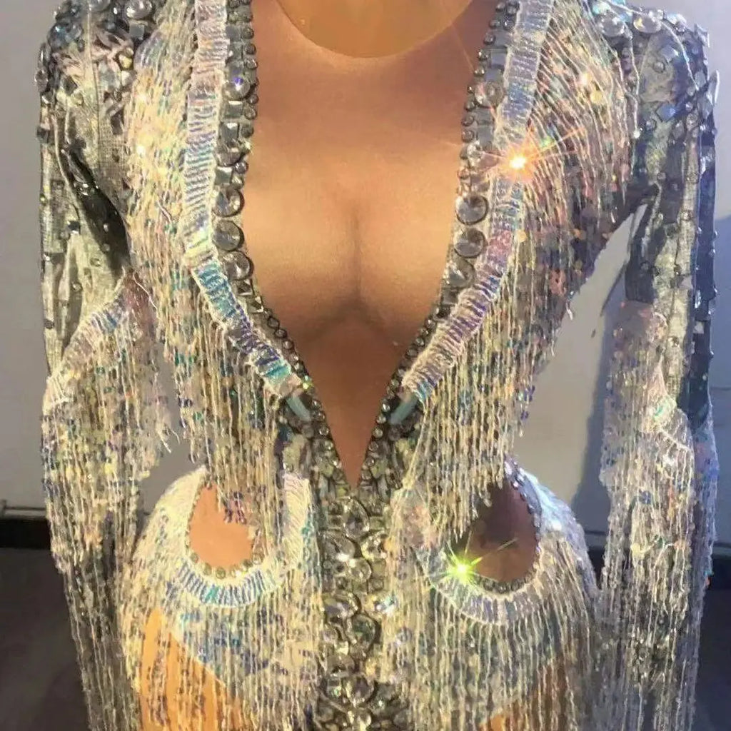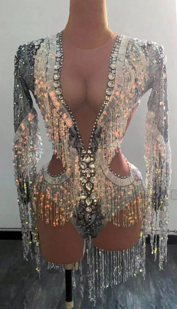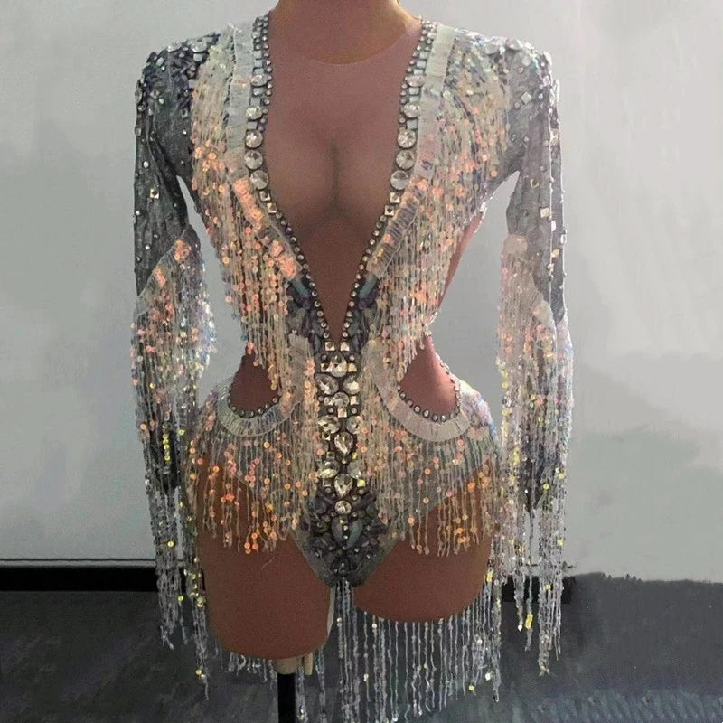 Silver Showgirl Stage Wear Rhinestone Bodysuit Costume Sequins Tassel Dance Jumpsuit Leotard