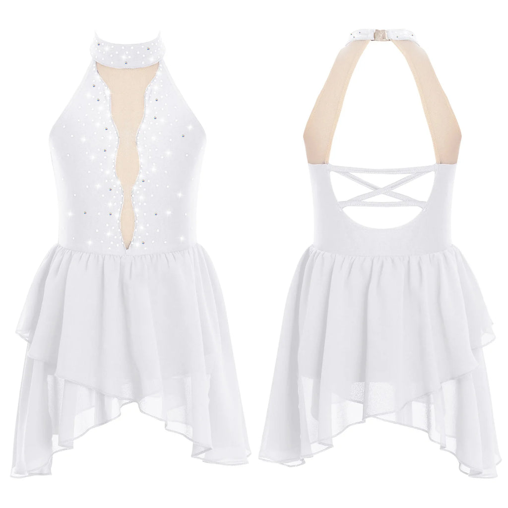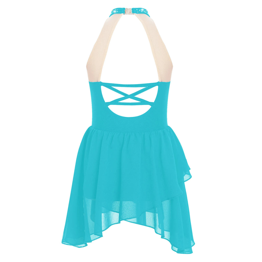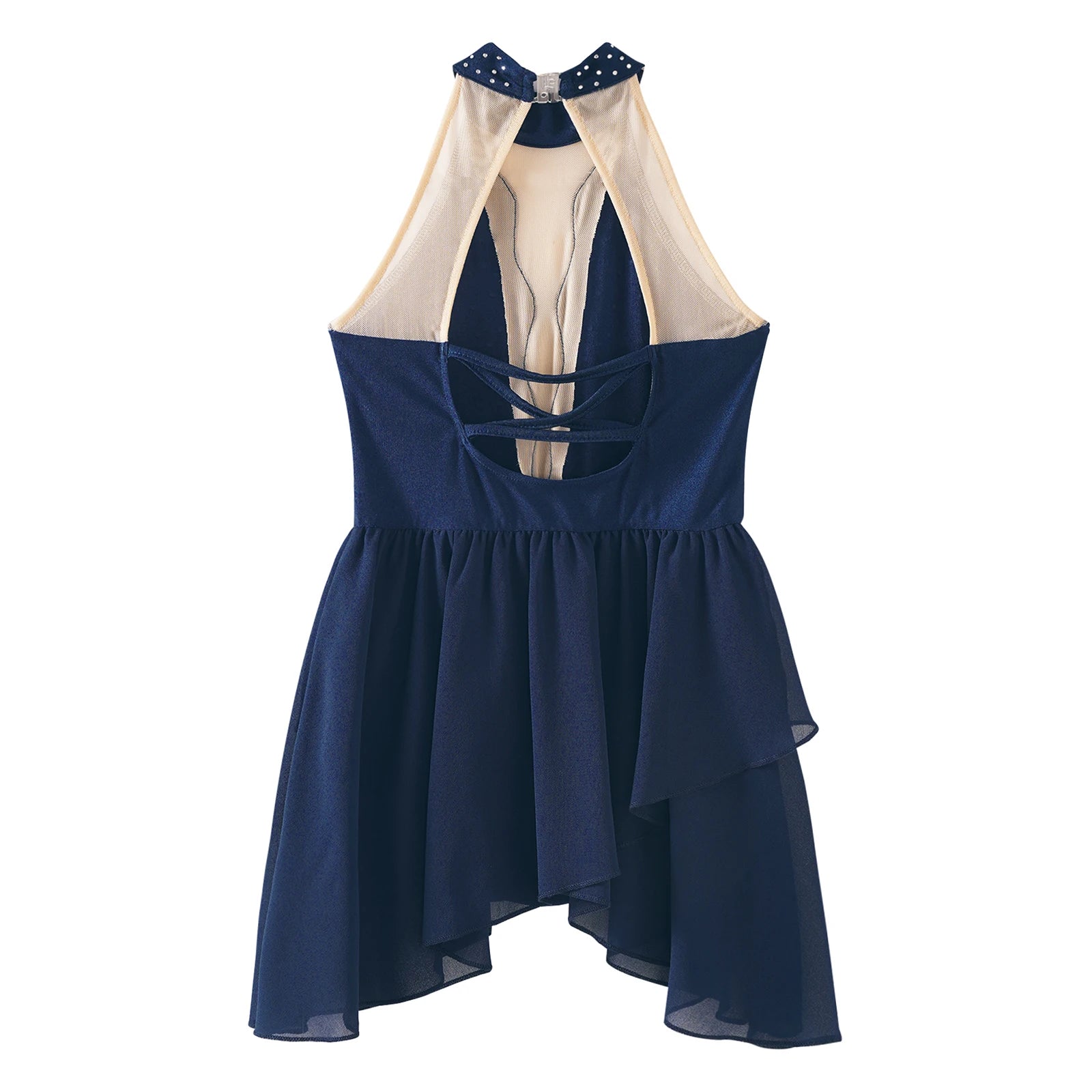 - Girls’ dance dress is decorated with rhinestones that sparkle under the lights to brighten up any performance.