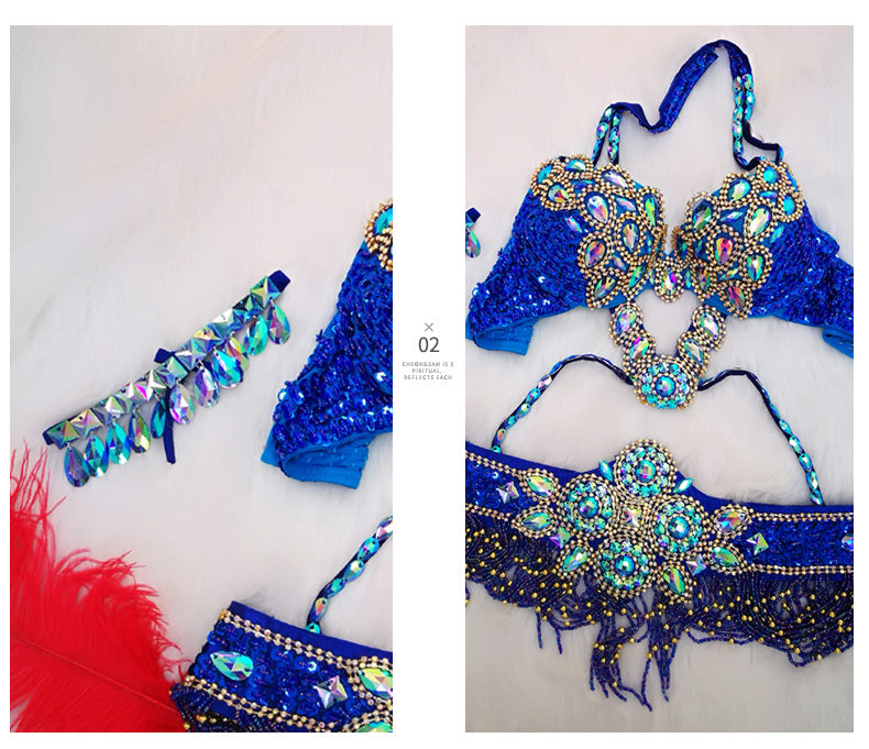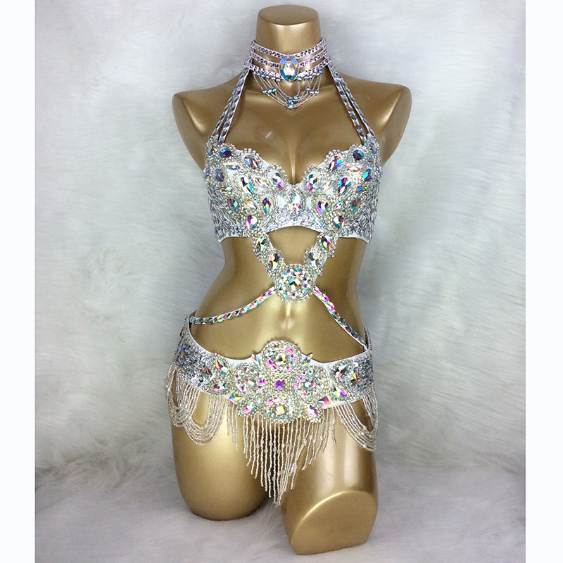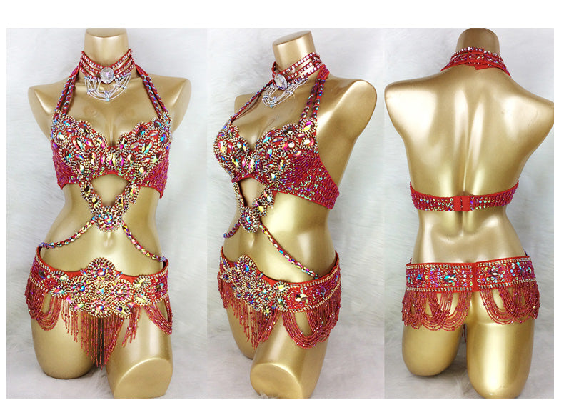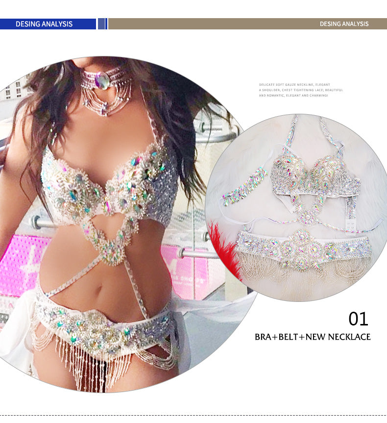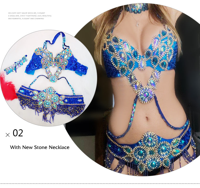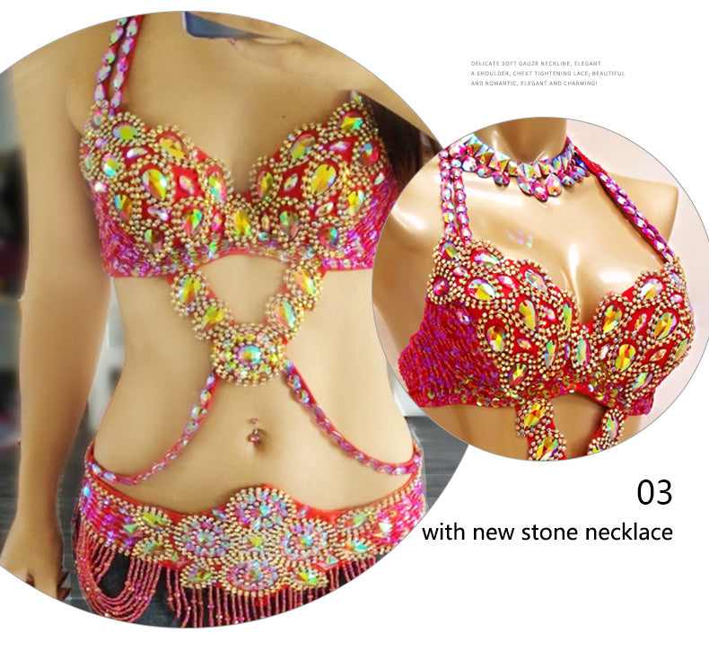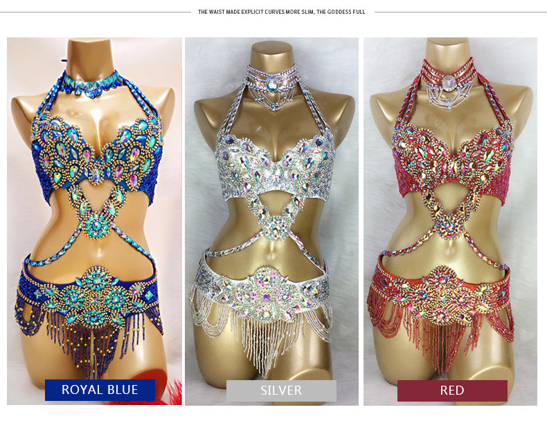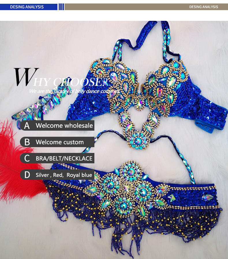 Beaded Crystal Belly Dance Costume Bra+Belt+Necklace 3pc Performance Set