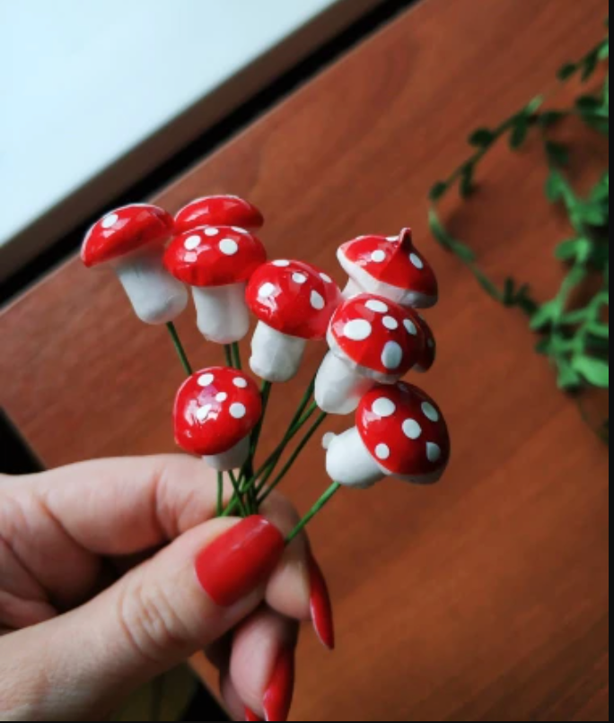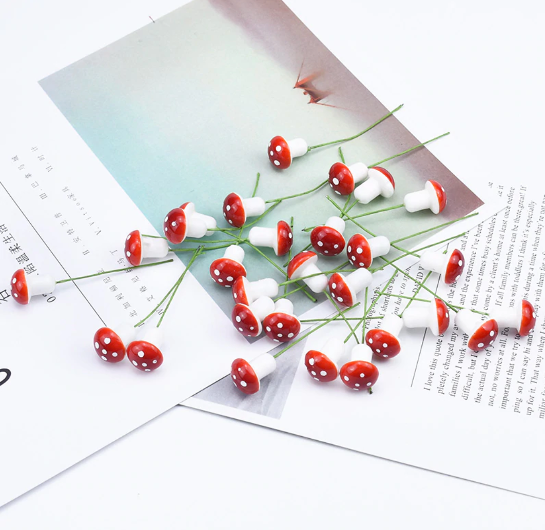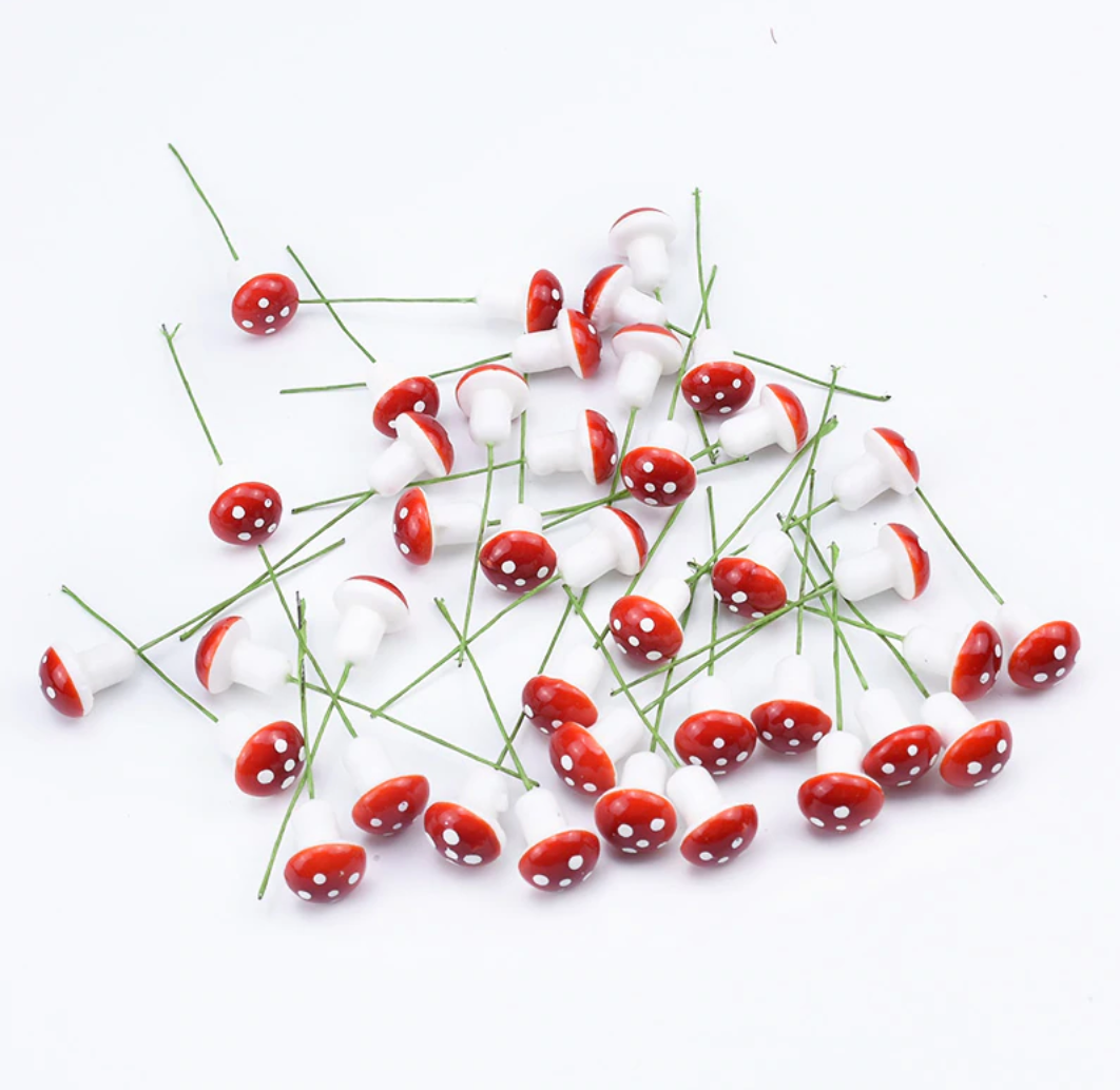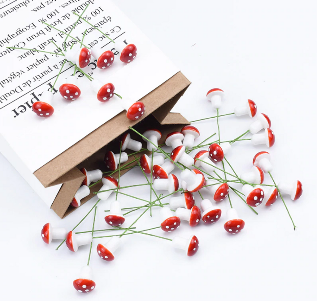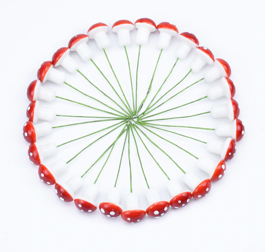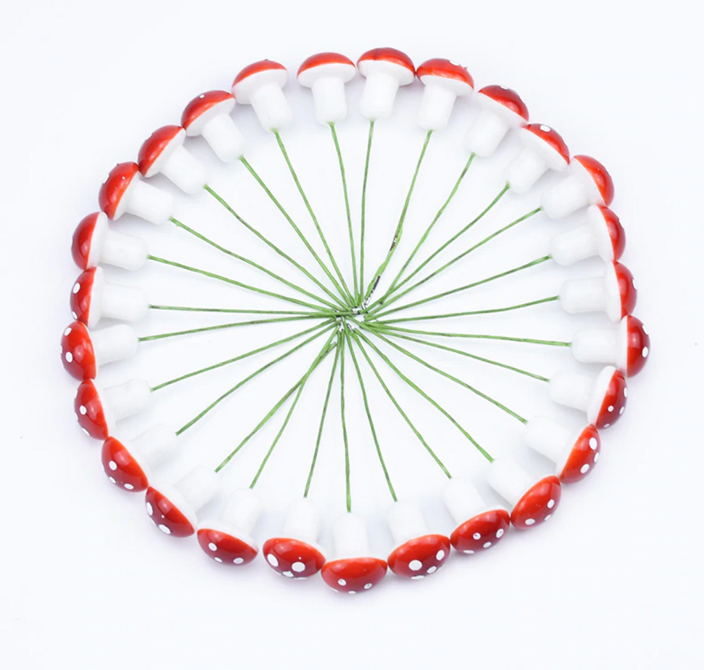 🍄 Ten, Thirty or FIFTY Wire Stem Red Mushroom picks for scattering whimsy and fun literally everywhere!  The wire stems allow you to stick these mushies into cakes, fairy gardens, your favourite stuffed toy, your teacher's hair... honestly the options are endless!  Curl the wire around some string to make a string garland!