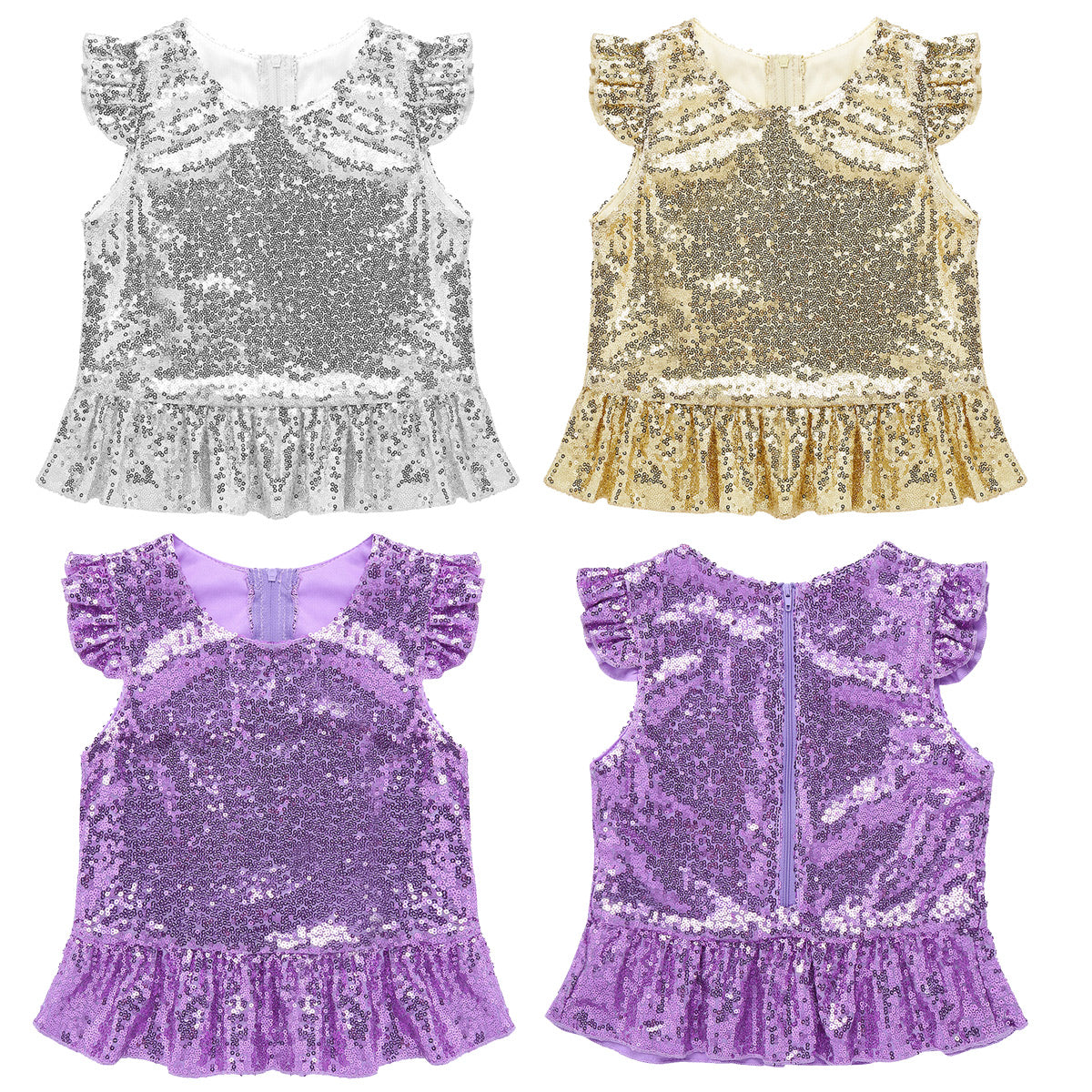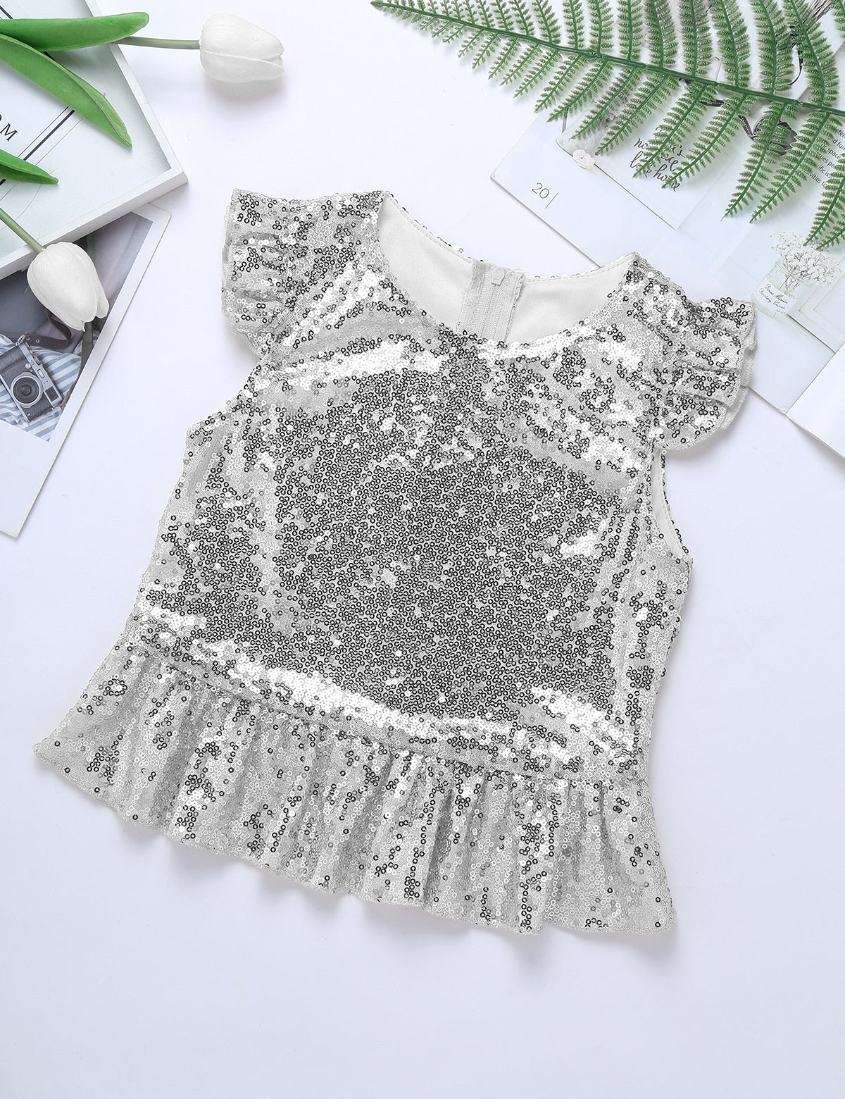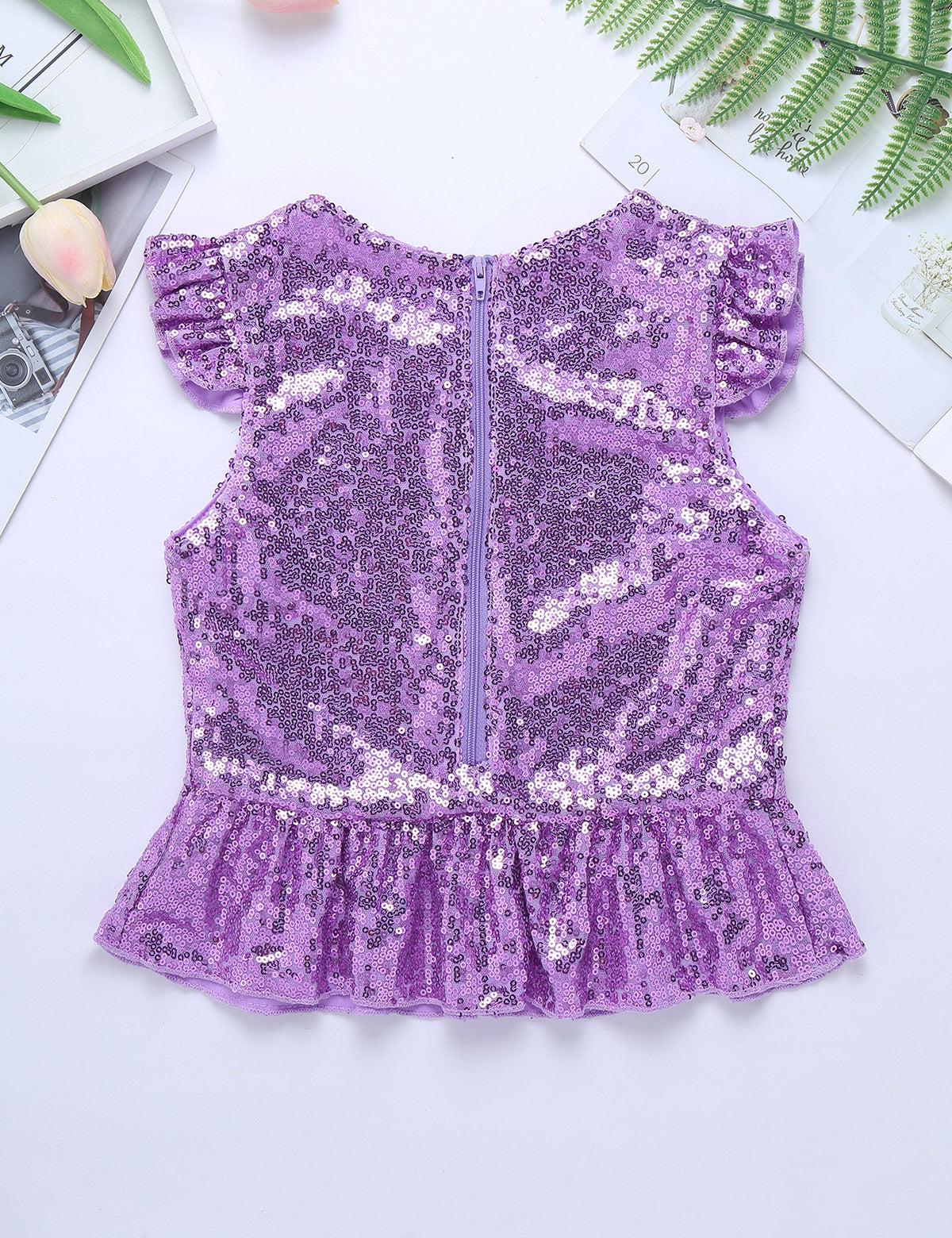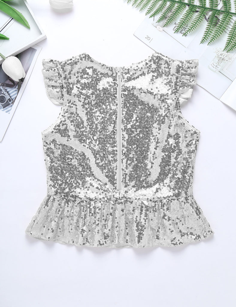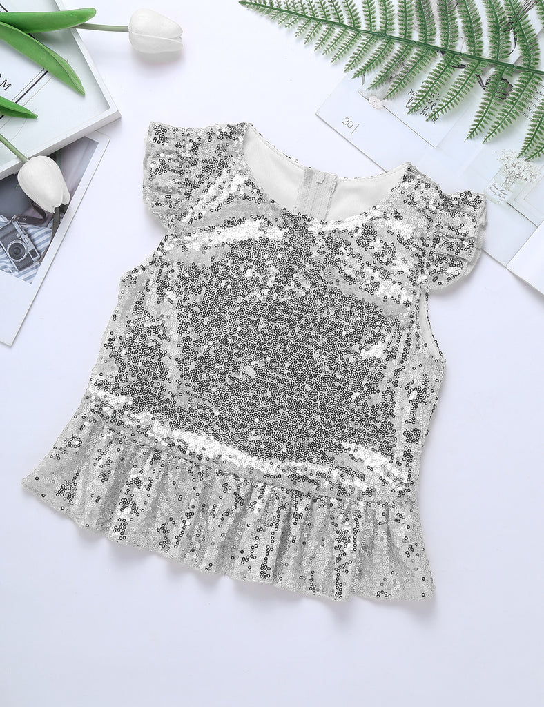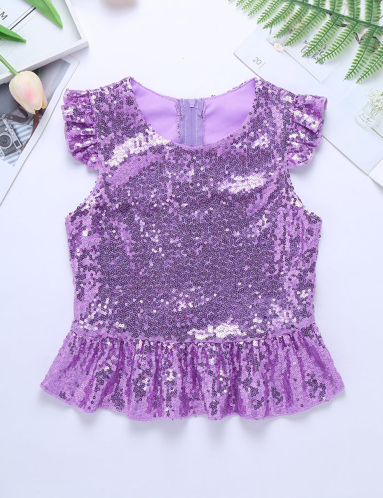 Girls Mermaid Sparkly Sequins Short Flutter Cap Sleeves Ruffle T-shirts Dance Performance Party Tops