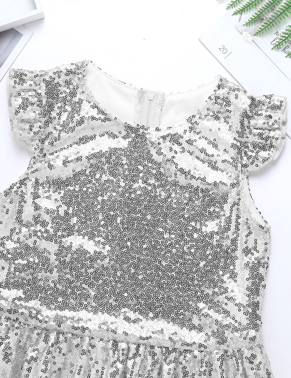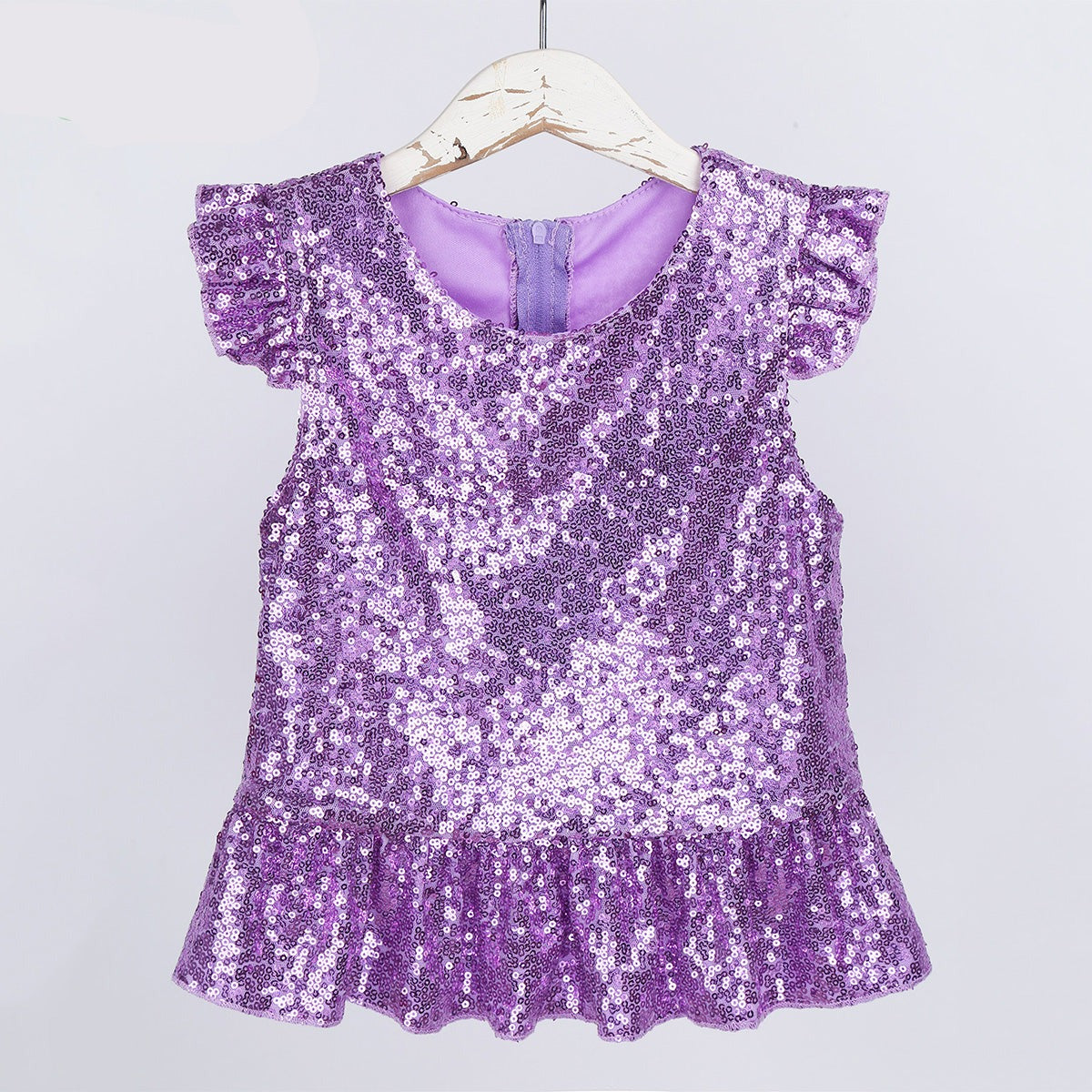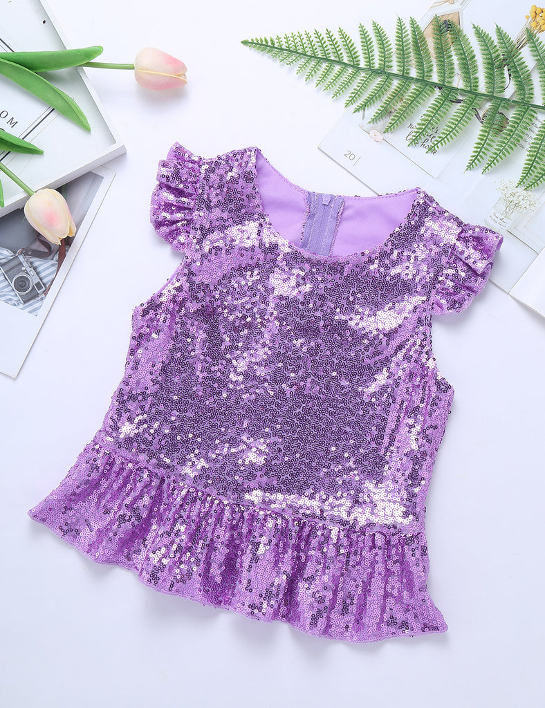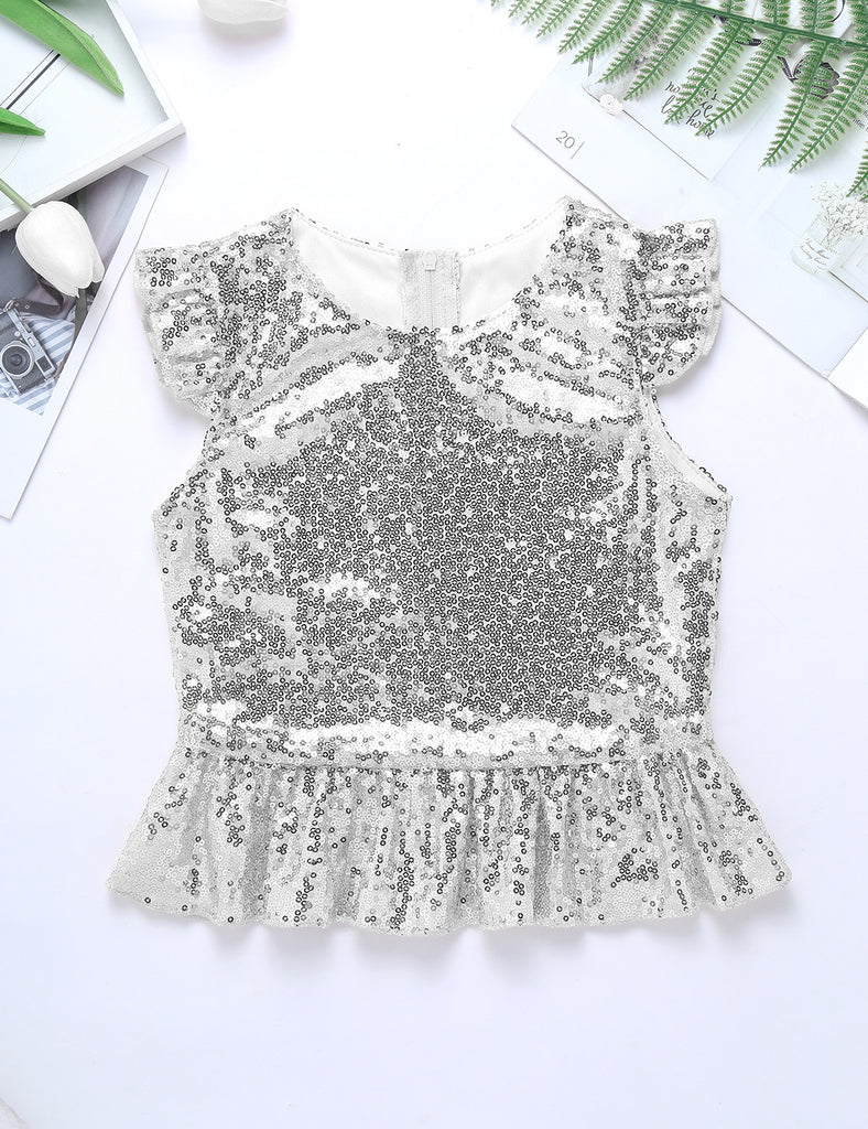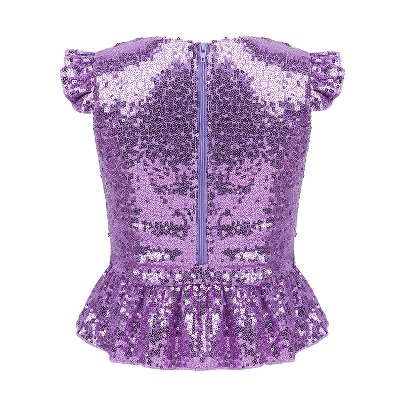 Girls Mermaid Sparkly Sequins Short Flutter Cap Sleeves Ruffle T-shirts Dance Performance Party Tops