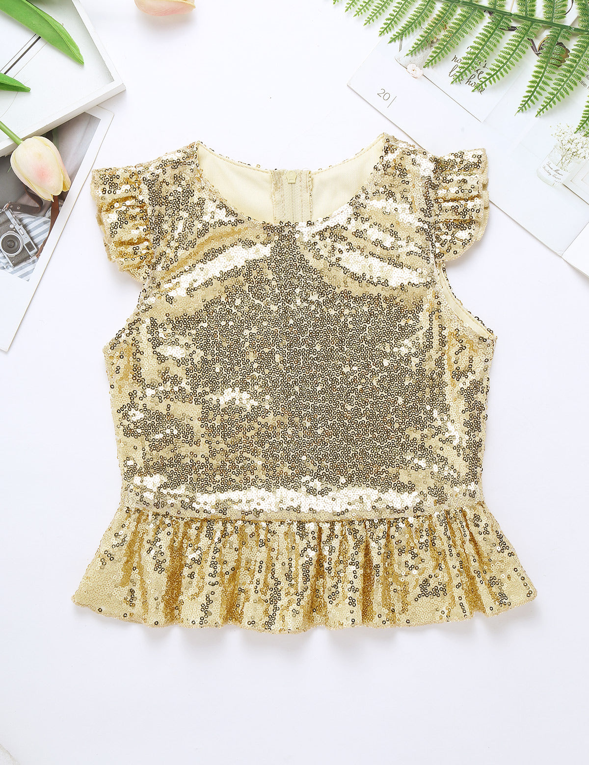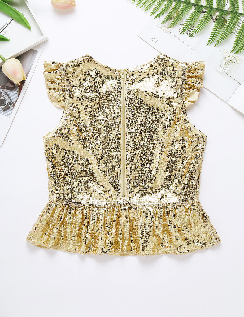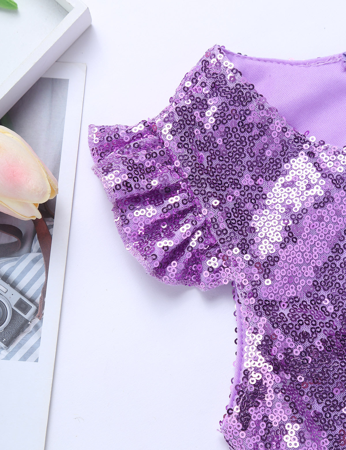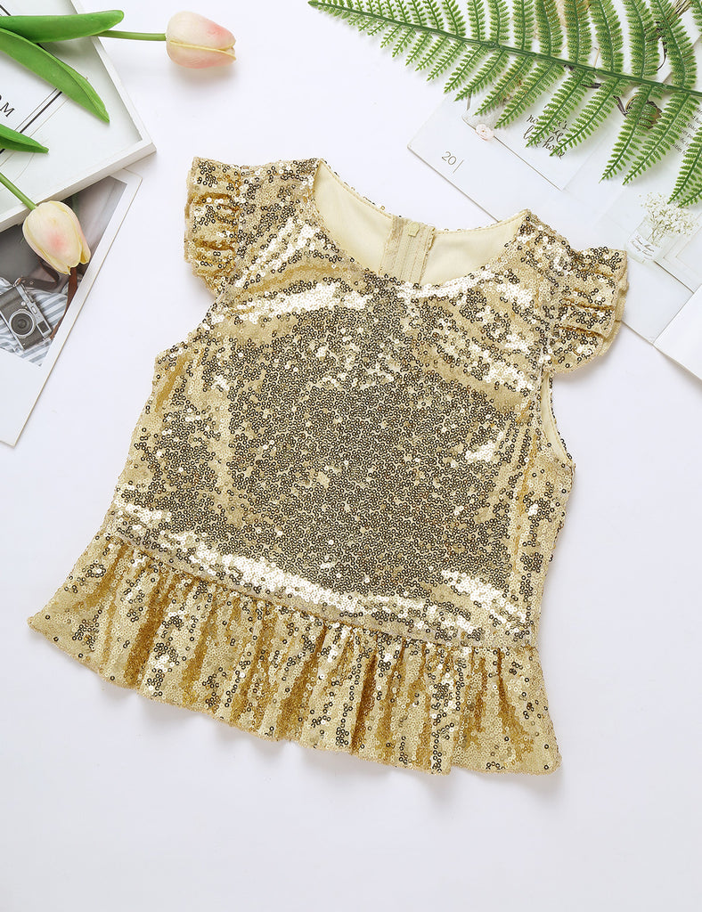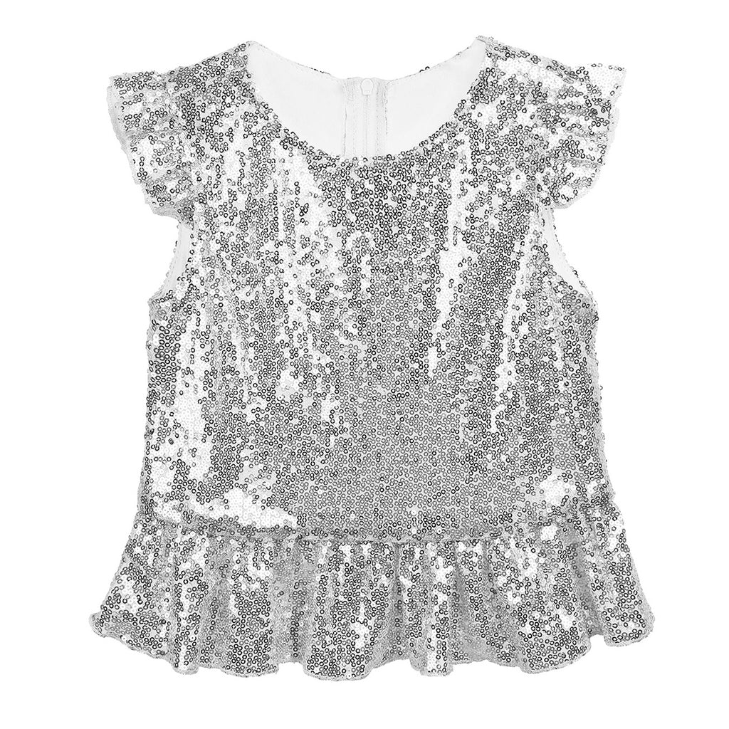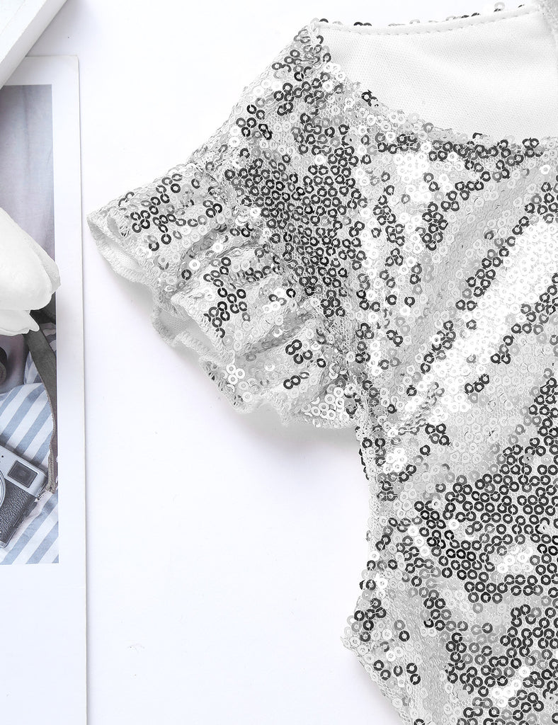 Girls Mermaid Sparkly Sequins Short Flutter Cap Sleeves Ruffle T-shirts Dance Performance Party Tops