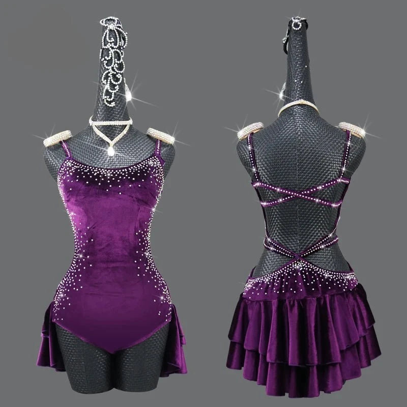 Purple Velvet Latin Dance Competition Bustle Dress Line Skirts Stage Costume