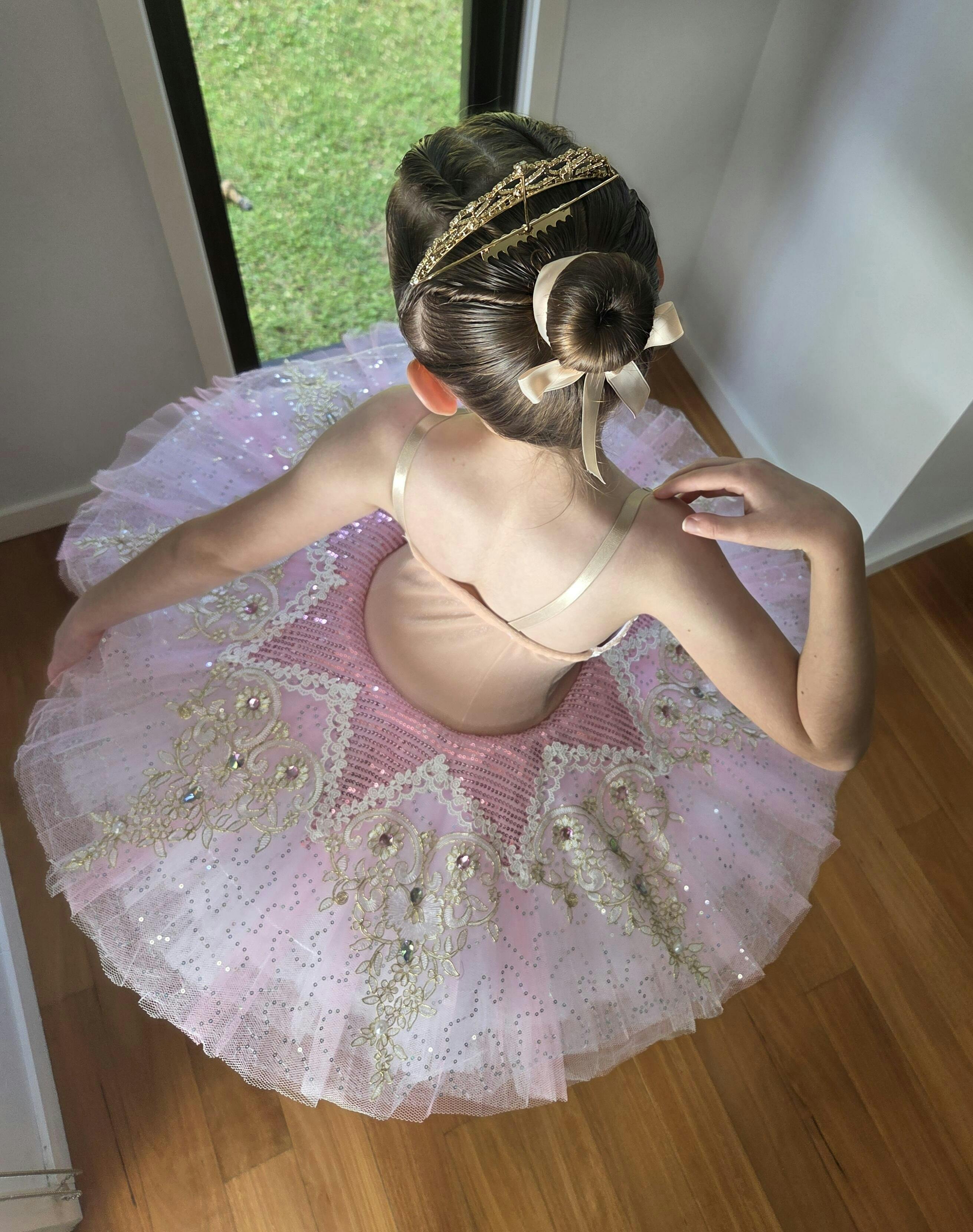 One enchanting day, as Seraphina twirled through the forest glades, the fairy folk granted her the most exquisite ballet tutu. This tutu, in the gentlest shade of pale pink, was adorned with rose gold embroidery and sequins that sparkled like dewdrops in the morning sun. Its bodice, a delicate ribbon princess design, wrapped around her like a crown, and the pancake tutu-style stiff skirt gave her movements the grace of a fluttering butterfly. Made from luxurious silk material, this tutu is well-crafted, soft, and comfortable, ensuring you feel like a true ballet princess.