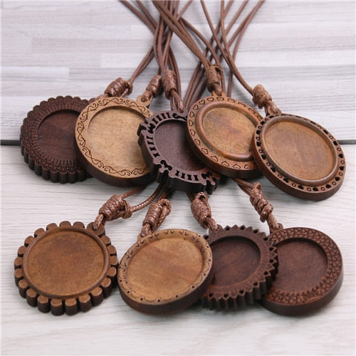 Sets of Five Wooden Blank Cameo Pendant Base Trays with Leather Cord for Jewellery Making.