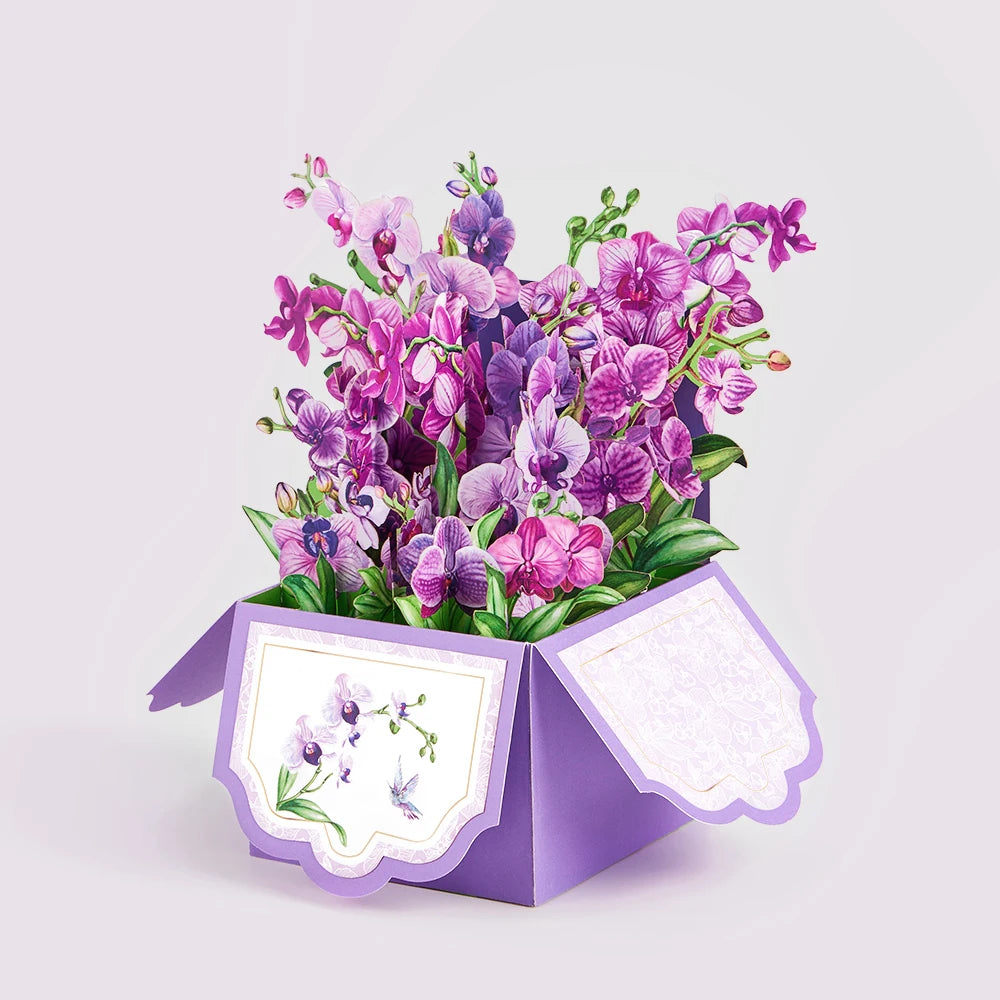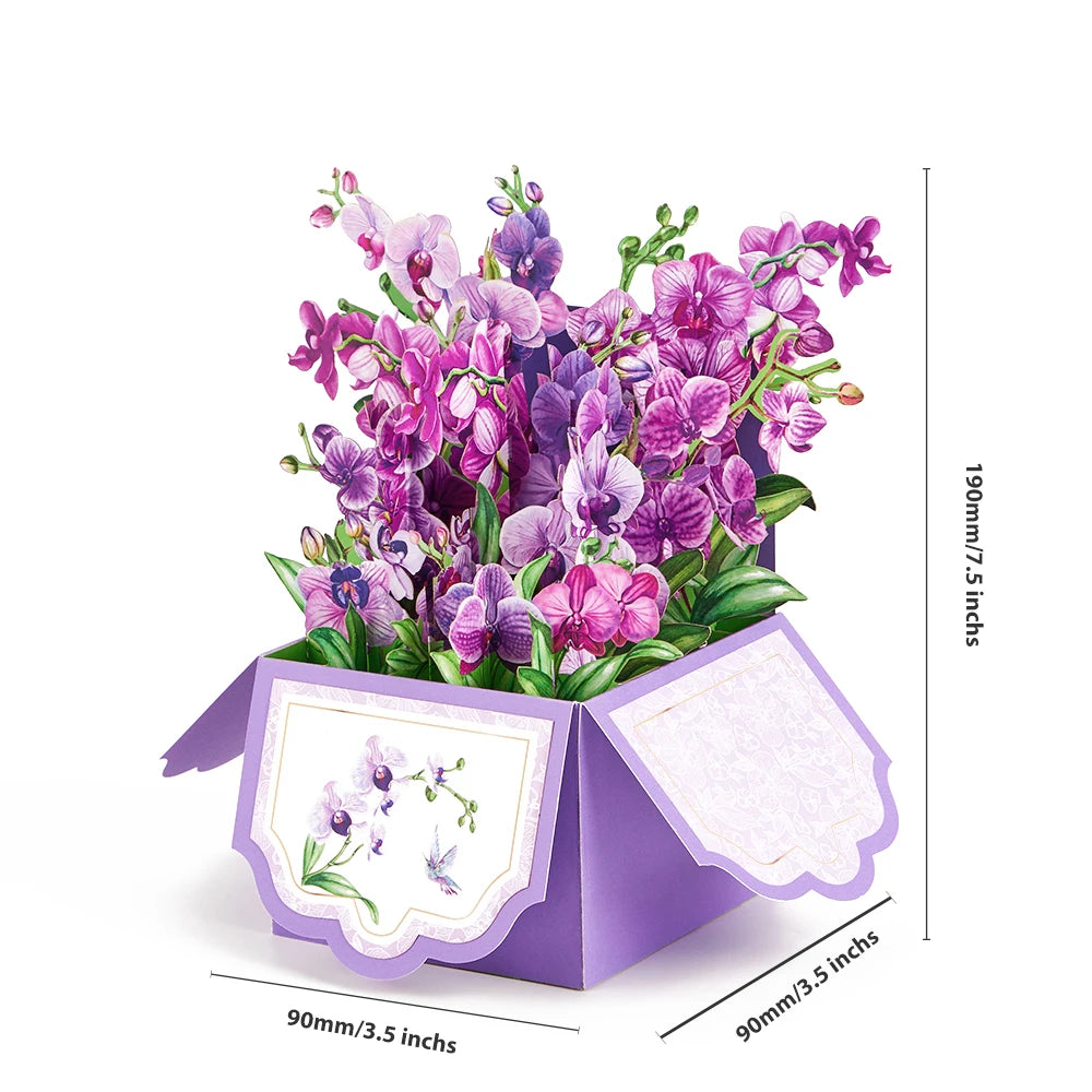 Package Included: A 3d pop-up card, a blank notecard on the back, and a coordinating white envelope. The Orchids Flower Pop Up Card is 3.6" wide by 7.6" tall when it unfolds.