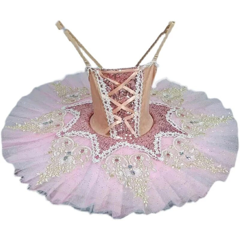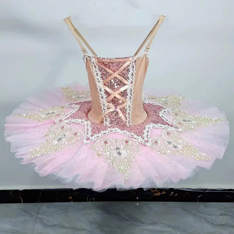 One enchanting day, as Seraphina twirled through the forest glades, the fairy folk granted her the most exquisite ballet tutu. This tutu, in the gentlest shade of pale pink, was adorned with rose gold embroidery and sequins that sparkled like dewdrops in the morning sun. Its bodice, a delicate ribbon princess design, wrapped around her like a crown, and the pancake tutu-style stiff skirt gave her movements the grace of a fluttering butterfly. Made from luxurious silk material, this tutu is well-crafted, soft, and comfortable, ensuring you feel like a true ballet princess.