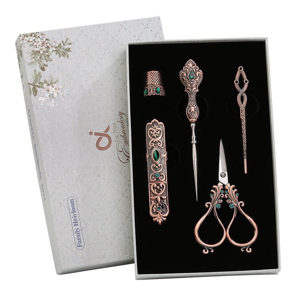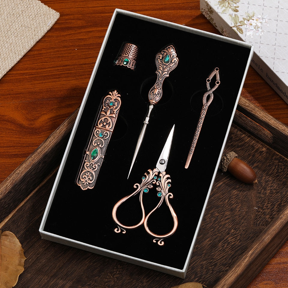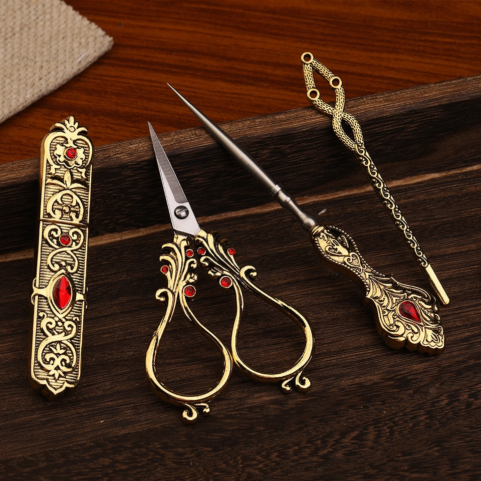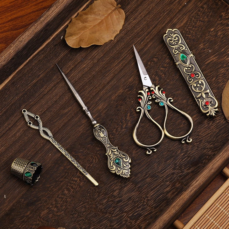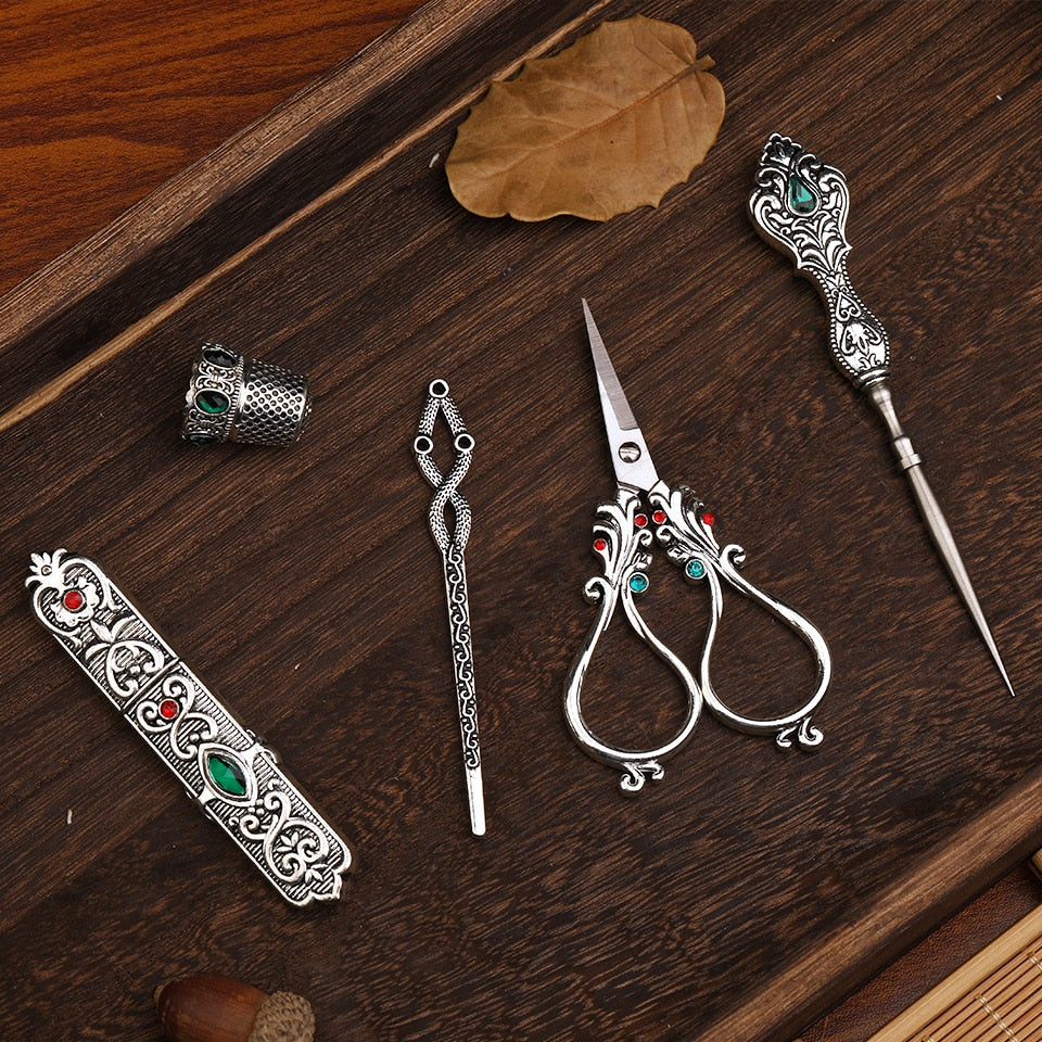 Tailors tools including stainless steel embroidery scissors, needle holder, awl, thimble, and threader.